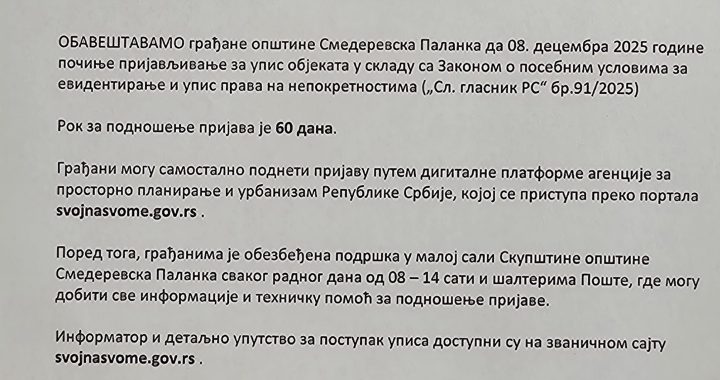 Обавештавамо грађане општине Смедеревска Паланка да 08. децембра 2025. године почиње пријављивање за упис објеката у складу са Законом о посебним условима за евидентирање и упис права на непокретностима („Службени гласник РС“, број 91/2025).